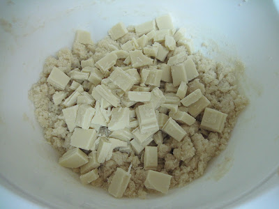 להוסיף את הקמח ואבקת האפיה לערבב עד לקבלת פרורים , להוסיף את קוביות השוקולד הלבן לערבב מעט .