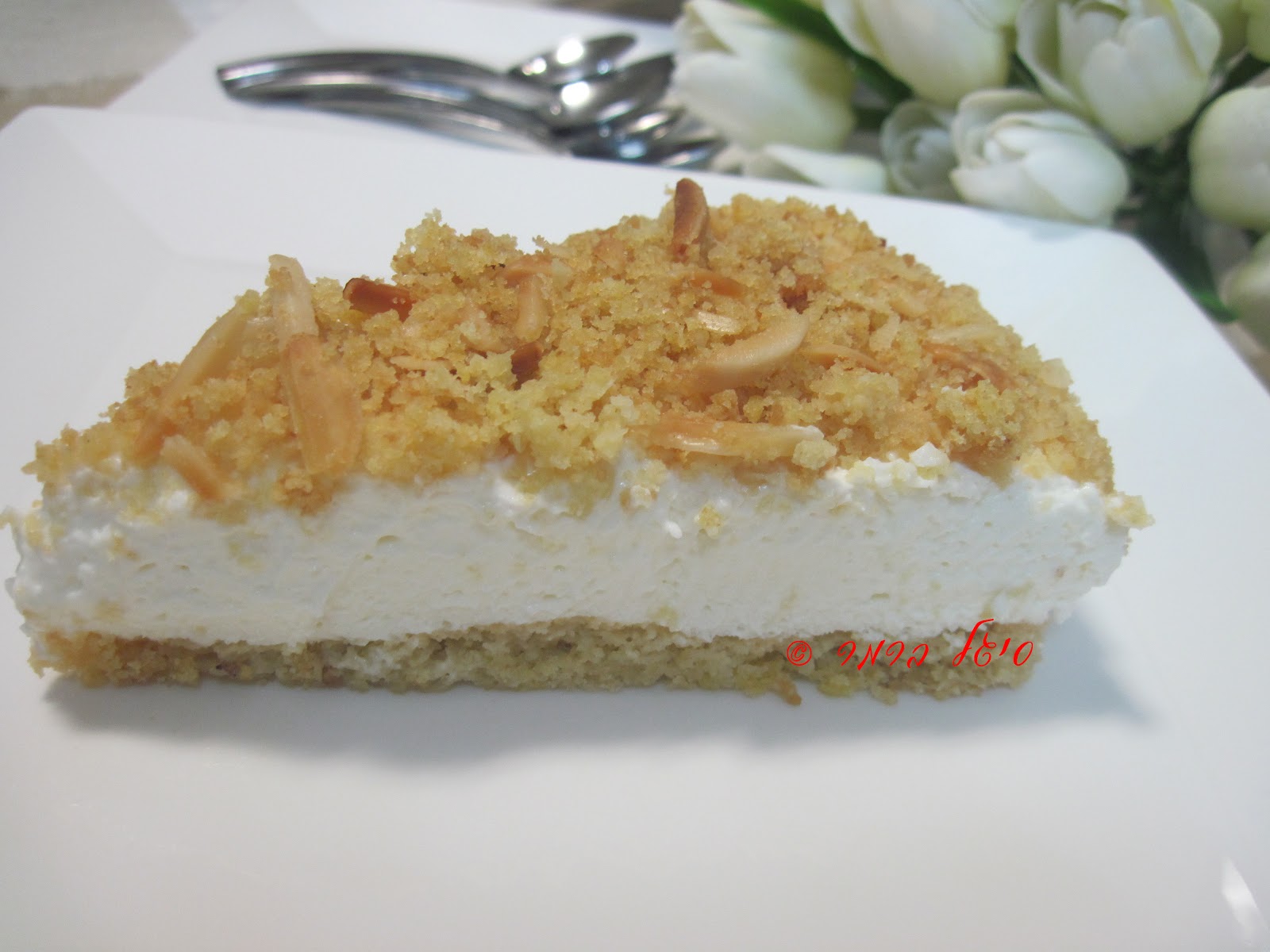 עוגת גבינה פרורוים טעימה ונימוחה בתוספת מקלות שקדים קריספיים שמוסיפים קראנצ'יות לעוגה , הקרם נטו גבינות ושמנת מתוקה , זהירות היא אפשר להפסיק לישר…..