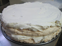 על צלחת עגולה / תחתית עגולה מניחים עיגול מרנג, מורחים 1/3 מהקרם עליו מניחים את המרנג השני ומורחים 1/3 מהקרם ביתרת הקרם מצפים את הצדדים עד לקבלת עוגה מצופה מכל הצדדים ( במידה ונשאר קרם מורחים אותו על החלק העליון של העוגה ומישרים בעזרת סכין רחבה . לשמור בקירור ל-6 שעות לפני ההגשה