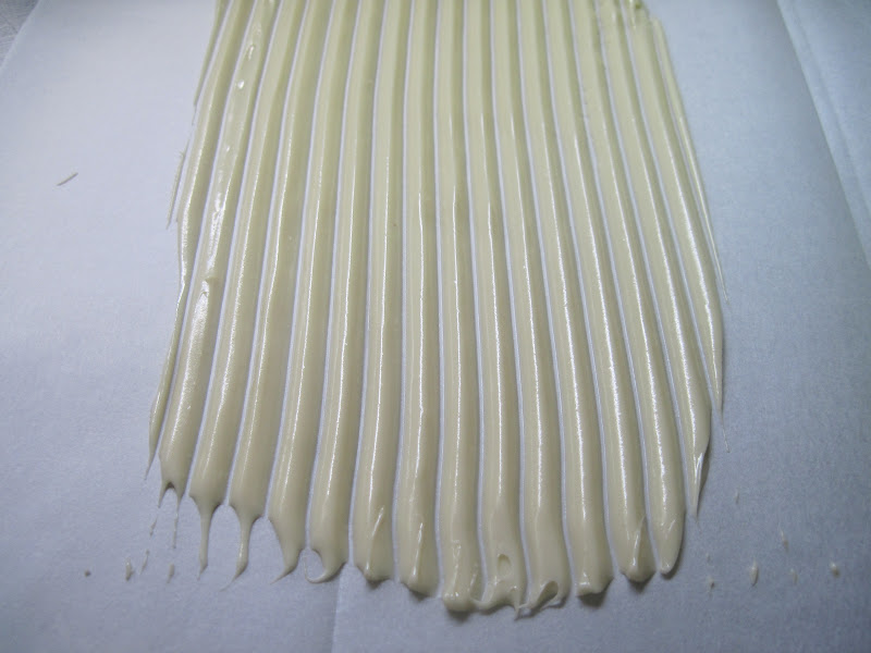 ממיסים 60 גרם שוקולד לבן במיקרוגל (או בקערה חסינת חום מעל סיר עם מים רותחים (בן מארי) עד שהשוקולד נמס) אם משתמשים במיקרוגל צריך לבדוק לאחר דקה כי השוקולד הלבן נשרף מהר) לתת לשוקולד להתקרר מעט כ-10 דקות אבל שישאר במצב נוזלי , למרוח בצורת מלבן את השוקולד על גבי נייר אפיה בעובי 1/2 ס"מ להכניס ל-1 דקה במקרר , להוציא ולסרק את השוקולד עם פלסטיק משונן (לרכוש בחנויות מתמחות 12 ש"ח ) להחזיר לקירור , לאחר כ- 15 דקות להוציא את נייר האפייה עם השוקולד שהתקשה לחתוך את המקלות שיצרנו לאורך שרוצים ולפזר על העוגה