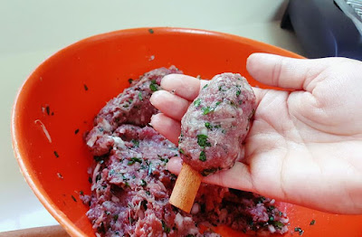 לקחת כדור בשר לשטח מעט על כף היד לשים באמצע את מקל הקינמון לסגור ולהדק היטב.