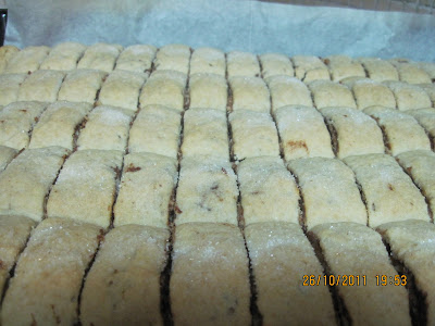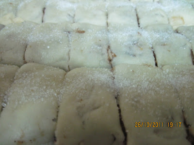 מחלקים את הבצק ל-5 יחידות שוות , מקמחים משטח עבודה (אני עובדת על נייר אפיה פחות מלכלך )מרדדים למלבן 1 יחידה של הבצק (ראה תמונה) מורחים 1/4 מקופסת ממרח התמרים (בסך הכל אני משתמשת בקופסה וחצי) בשכבה אחידה, מפזרים מעט קינמון, ואגוזים , מגלגלים לרולדה (ראה תמונה) מסדרים בתבנית (משטחים את הרולדה בתבנית עם היד ראה תמונה) מסדרים את הרולדות צמודות אחת לשנייה , חותכים את הרולדות לפני האפייה למלבנים (ראה תמונה) ומפזרים סוכר רגיל לקישוט, אופים בחום 180 מעלות כ-30 דקות , לאחר 30 דקות עוברים על החיתוך שביצענו ואופים עוד 10 דקות, עד שהעוגיות זהובות, לאחר שהעוגיות מתקררות יש להוציא אותם מהתבנית ולשמור בכלי אטום,